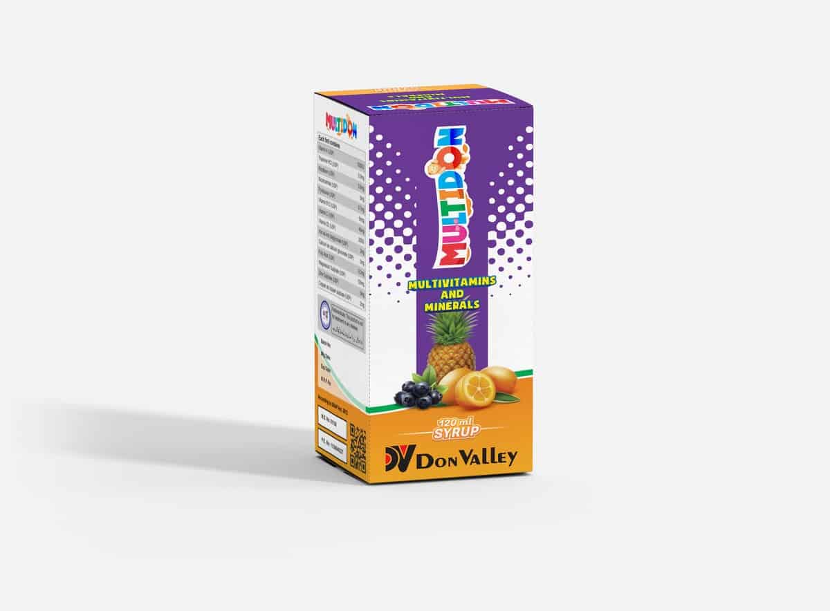 | 21 | Multidon Syrup | Each 5ml contains: Vitamin A (USP)………………………………..…..1000IU Thiamine HCI (USP)……………………………..….0.5mg Riboflavin (USP)………………………………….…0.8mg Nicotinamide (USP)…………………………….....….5mg Pyridoxine (USP)…………………………………..0.75mg Vitamin B12 (USP)………………………………......5mcg Vitamin C (USP)..........................................................40mg Vitamin D3 (USP)........................................................200IU Iron as iron bisglycinate (USP).....................................2mg Calcium as calcium gluconate (USP)..........................5mg Folic Acid (USP).........................................................0.2mg Magnesium Sulphate (USP).....................................100mg Zinc Sulphate (USP)......................................................5mg Copper as copper sulphate (USP)..............................2mg | 120ml |